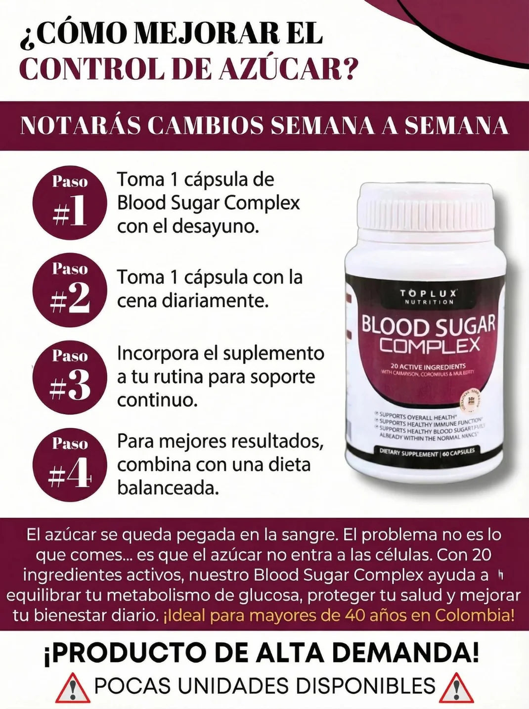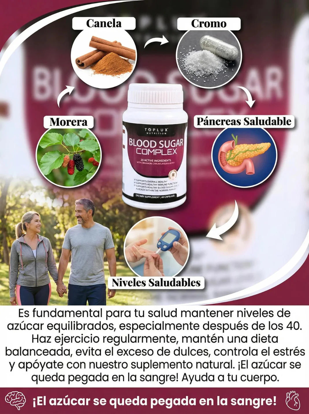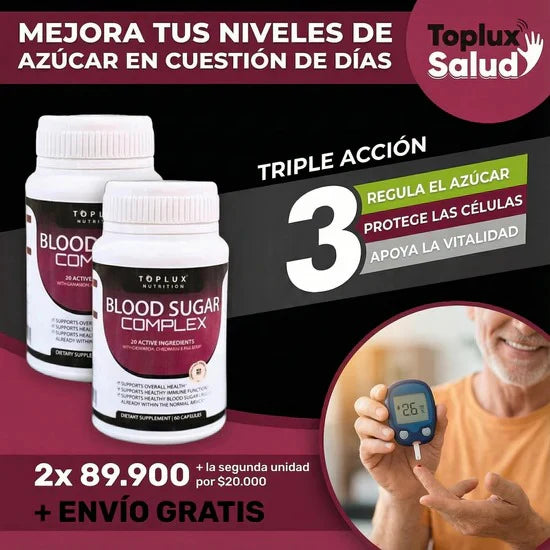 Blood Sugar Complex es un suplemento nutricional diseñado para apoyar el equilibrio de los niveles de azúcar en sangre, ayudando al metabolismo de la glucosa y al bienestar general. Su fórmula combina 20 ingredientes activos reconocidos, como canela orgánica, cromo y mora blanca, que trabajan de forma natural para apoyar una vida más estable y saludable.