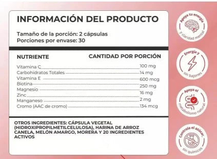 Cada frasco contiene 60 cápsulas diseñadas para uso diario. La forma de consumo debe seguir las indicaciones del envase. Un frasco suele rendir hasta 30 días, dependiendo de la dosis recomendada. La constancia es clave para obtener mejores resultados.