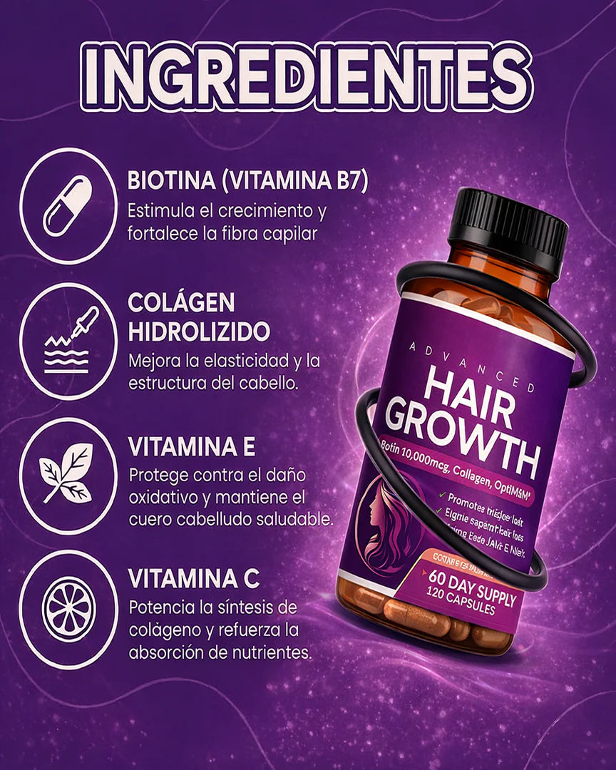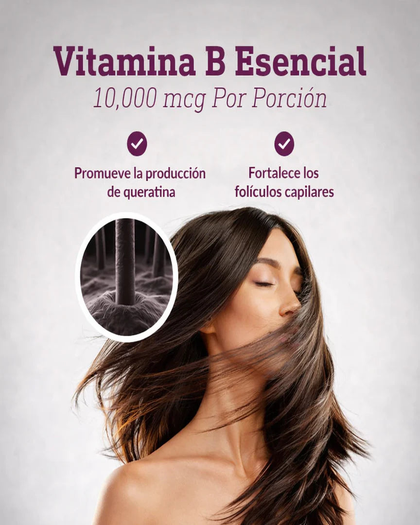 Está elaborado con vitaminas e ingredientes comúnmente utilizados en suplementos capilares. Al ser un suplemento, se recomienda seguir la dosis indicada. Si estás embarazada, en lactancia o bajo tratamiento médico, consulta a tu médico antes de consumirlo.
